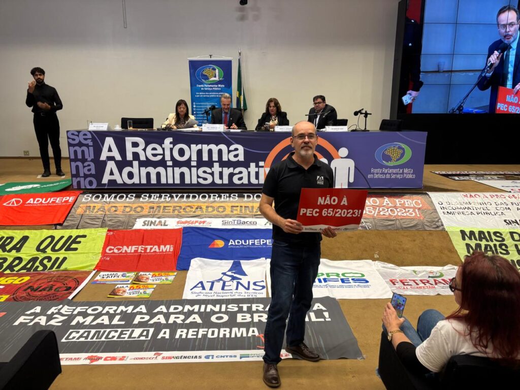 Na terça-feira, 8, o PROIFES-Federação participou do seminário promovido pela Frente Parlamentar Mista em Defesa do Serviço Público, que debateu os impactos da proposta de reforma administrativa em tramitação no Congresso Nacional. O evento reuniu servidores públicos, sindicalistas e parlamentares, que classificaram a medida como uma verdadeira “demolição” do serviço público, por precarizar carreiras, desestruturar vínculos e comprometer a qualidade dos serviços essenciais oferecidos à população. O diretor Paulo Artur Konzen Xavier de Mello e Silva, 2º Tesoureiro e Diretor de Assuntos Jurídicos da ADUFRGS-Sindical, acompanhou a mobilização junto ao PROIFES-Federação.