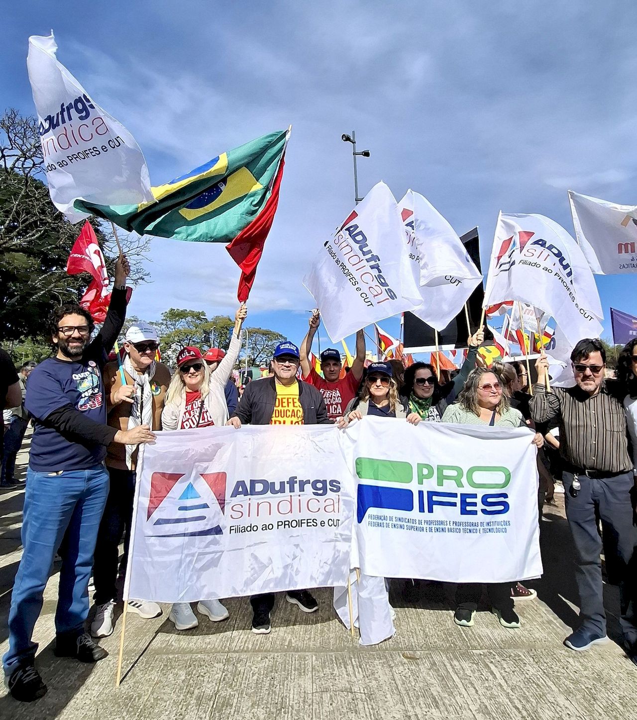 A ADUFRGS-Sindical marcou presença no ato de domingo, 7 de Setembro, Dia da Independência, pela soberania do Brasil, contra a anistia para golpistas, pela educação, pela ciência, por justiça fiscal e pelos trabalhadores. O presidente Jairo Bolter, a vice Cleidilene Magalhães e os diretores Ionara Siqueira (Assuntos da Carreira de Magistério Superior), Roger Elias (Assuntos da Carreira EBTT), Mariliz Gutterres (Assuntos de Aposentadoria e Previdência), Daniela Fialho (Comunicação), Conrado Chagas (Relações Sindicais), além de filiadas e filiados que com a bandeira da ADUFRGS e do Brasil se juntaram à diretoria. Conforme a CUT Rio Grande do Sul, mais de 2 mil pessoas participaram do ato pela soberania em Porto Alegre.