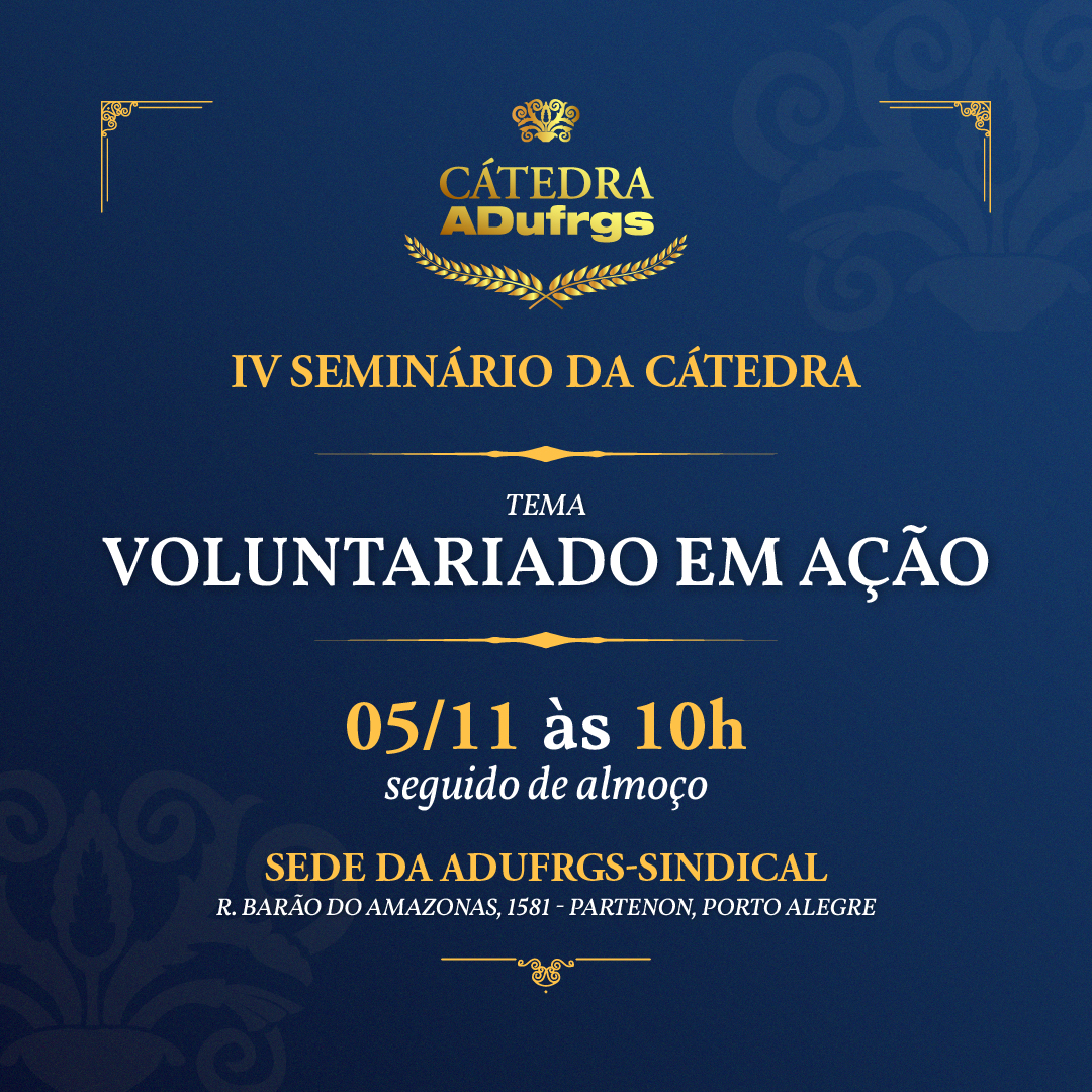 A ADUFRGS-Sindical realiza o IV Seminário da Cátedra ADUFRGS no dia 5 de novembro, na Sede do Sindicato (rua Barão do Amazonas, 1581, Porto Alegre). A atividade inicia às 10h, com palestra e debate com o tema “Ações de Voluntariado ou Voluntariado em Ação”. Na sequência, haverá o tradicional almoço para os professores aposentados filiados e filiadas.