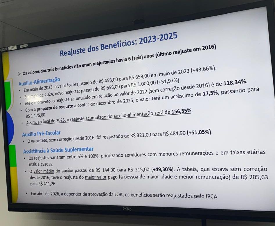 O sindicalista avaliou ainda que o processo de retomada da negociação está sendo positivo. “Conseguimos avançar na reestruturação da carreira. No ano que vem, fruto do acordo que nós assinamos, haverá um reajuste de 3,5%, mais um reajuste dentro da reestruturação da carreira que continua em 2026 também. Então, vamos ter um reajuste para além da inflação do período, recuperando em partes as perdas que nós tivemos ao longo dos últimos seis anos, considerando governos anteriores, em que ficamos sem reajuste tanto salarial quanto nos auxílios. Também ficamos com a carreira estagnada e não conseguimos avançar naquele período”, disse Bolter.