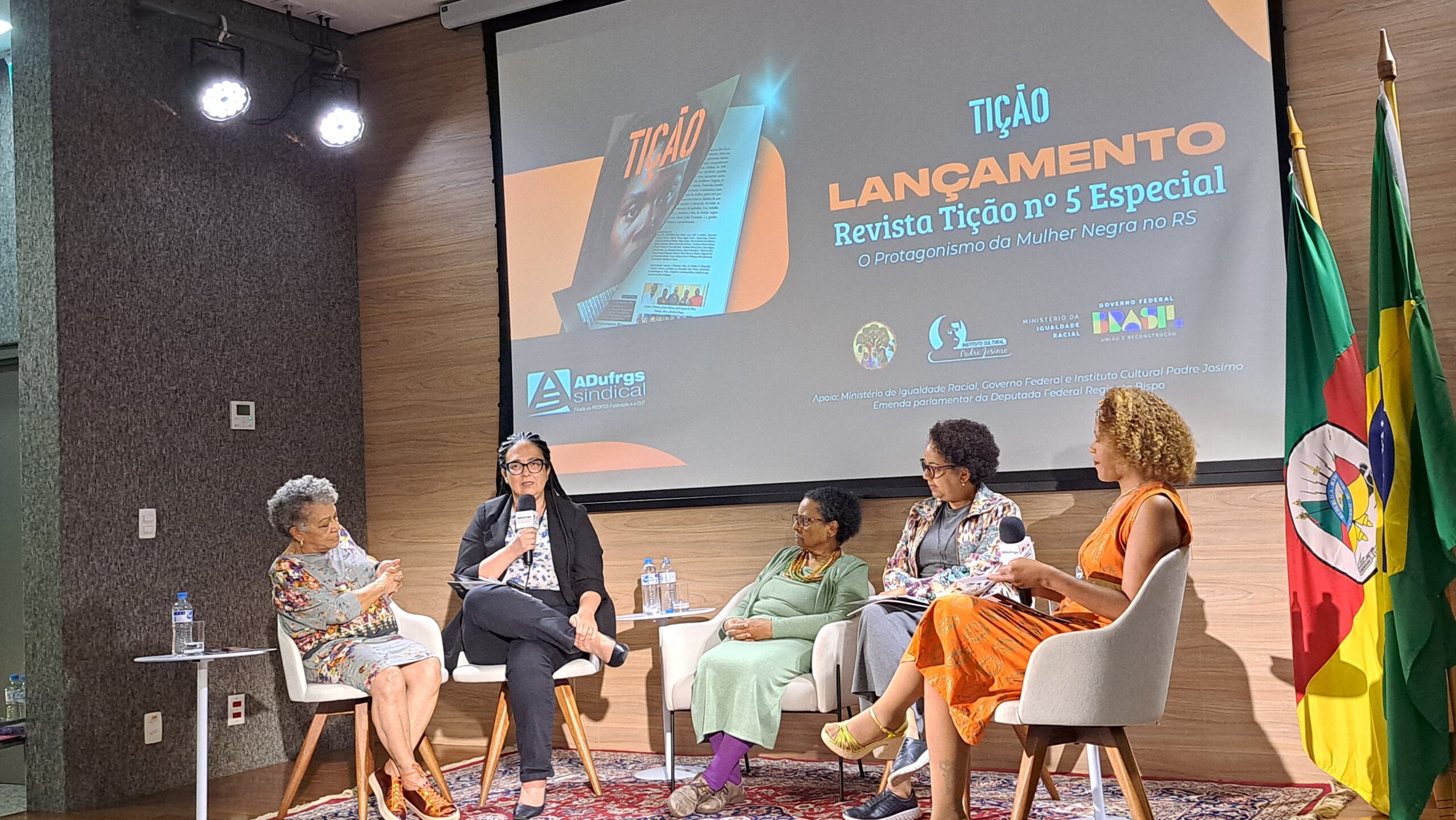 A ADUFRGS-Sindical realizou nesta segunda-feira, 17, debate sobre o Protagonismo da Mulher Negra no RS, juntamente com o lançamento da Revista Tição nº 5 Especial. O debate, transmitido pelo YouTube do Sindicato, reuniu as professoras Sandra de Deus (Fabico/UFRGS), Aline Cunha (Faced/UFRGS), a psicóloga Maria Luísa Oliveira (HC/UFRGS), a jornalista Jeanice Dias Ramos (Revista Tição) e mediado pela jornalista Simone Ramos (ADUFRGS).