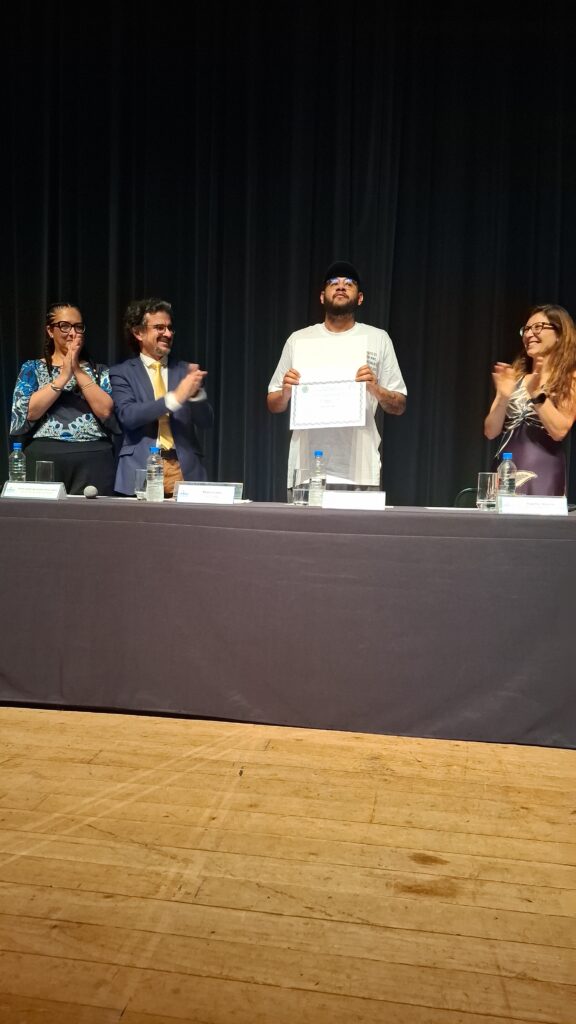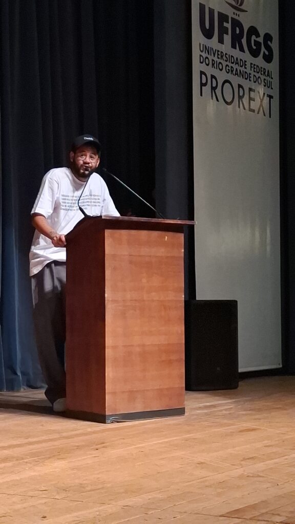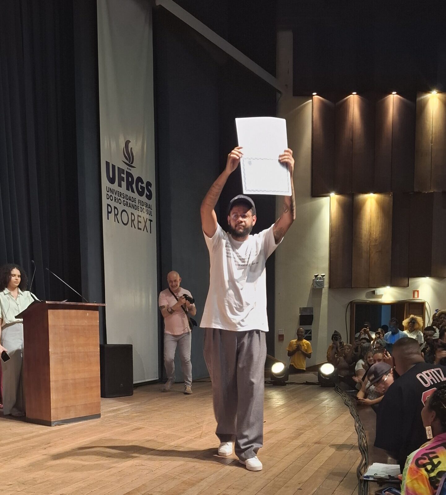 No final da tarde de sábado (29/11), a ADUFRGS-Sindical acompanhou a Sessão Solene do Conselho Universitário (Consun) da UFRGS de outorga do título de Doutor Honoris Causa ao rapper, cantor e compositor Leandro Roque de Oliveira, o Emicida.