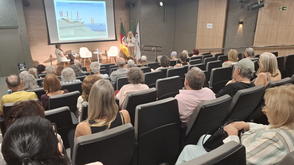 Na abertura, a Profa. Dra. Mariliz Gutterres, a diretora de Assuntos de Aposentadoria e Previdência da ADUFRGS-Sindical, falou sobre as causas e os impactos do aquecimento global. Ela criticou a aprovação do PL da Devastação uma semana após a Conferência do Clima da ONU, a COP30. Segundo a professora, a decisão coloca em risco os compromissos da COP30 para zerar o desmatamento e nos afastar dos combustíveis fósseis. “É uma ameaça à biodiversidade”, denunciou.