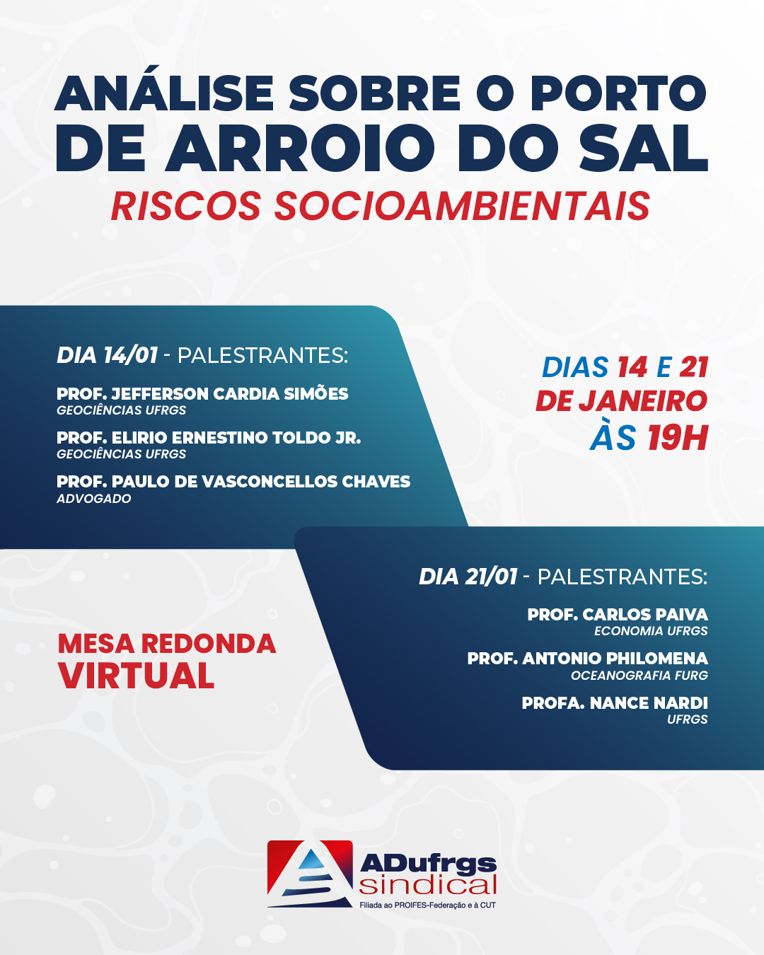 A ADUFRGS-Sindical realizará, nos dias 14 e 21 de janeiro, às 19h, duas mesas-redondas virtuais para debater os riscos socioambientais do Porto de Arroio do Sal. Para participar é necessário preencher o link de inscrição abaixo.