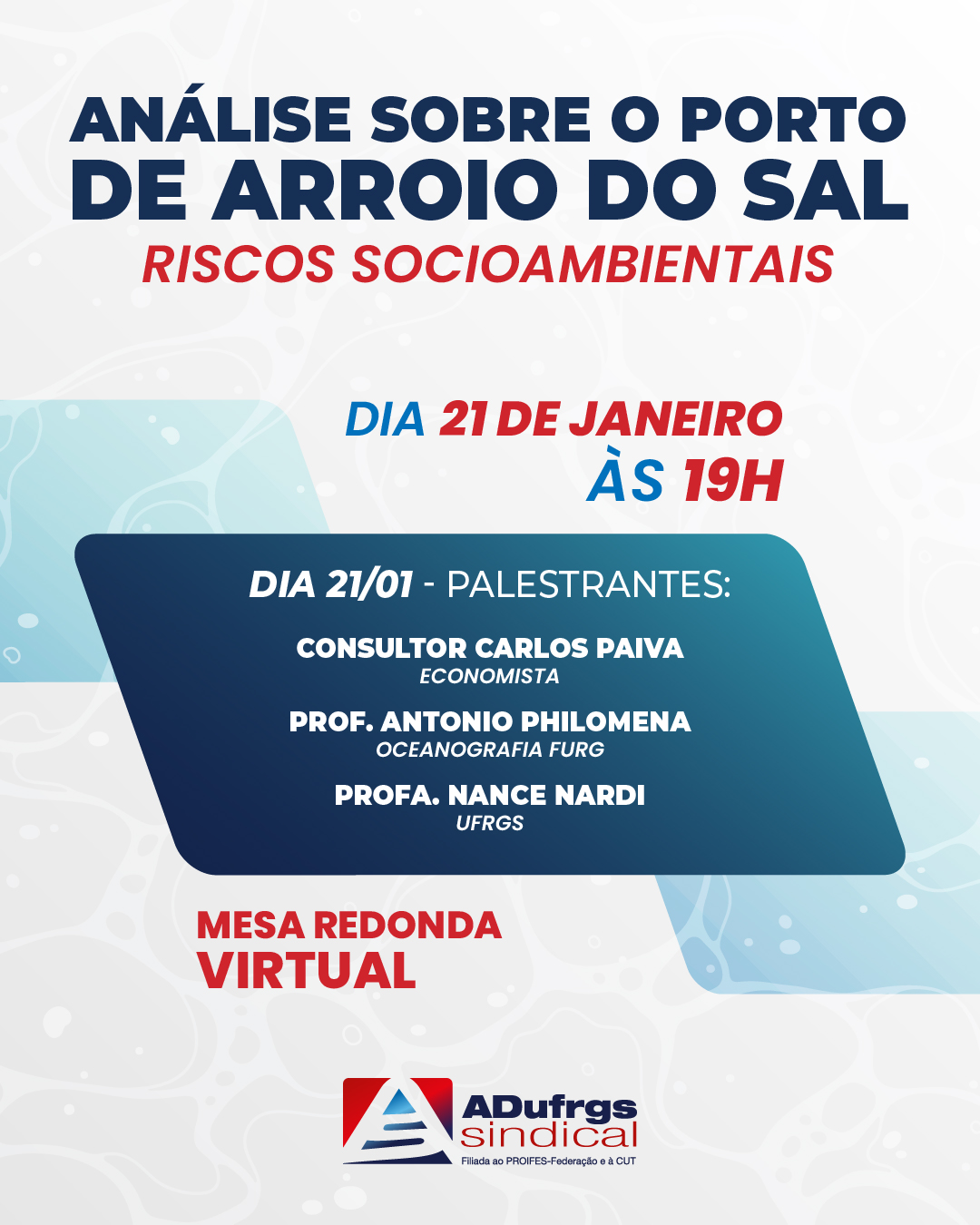 No dia 21 de janeiro, às 19h, a ADUFRGS-Sindical realizará mais uma mesa redonda virtual com o tema: Análise sobre o Porto de Arroio do Sal – Riscos Socioambientais. Para participar é necessário preencher o link de inscrição AQUI.
