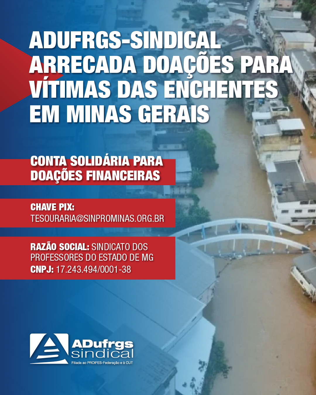 Diante do desastre em Minas Gerais, a ADUFRGS-Sindical fará uma doação financeira para ajudar as famílias atingidas pelas enchentes e pede apoio dos docentes filiados ao sindicato e da população para aderirem a campanha de arrecadação organizada pela Confederação Nacional dos Trabalhadores em Educação (CNTE) e Sindicato dos Professores de Minas Gerais (SINPROMG).