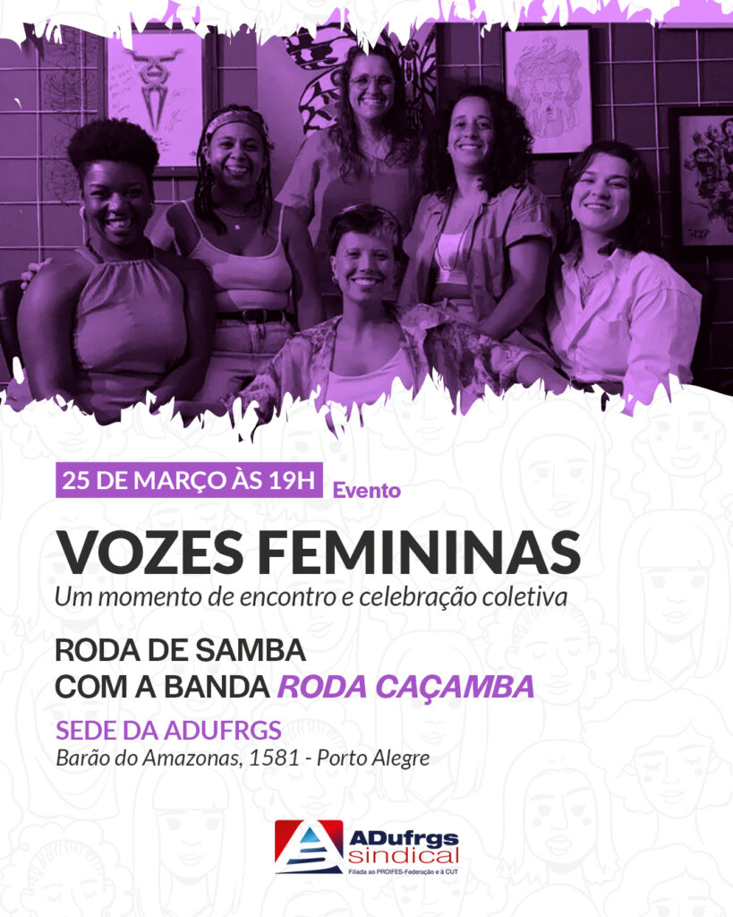 “Diálogos sobre violências/assédios no ambiente da Universidade: perspectivas de gênero e de trabalho” é o tema da mesa-redonda promovida pela ADUFRGS-Sindical em alusão ao Mês da Mulher. O evento acontecerá no dia 25 de março, às 17h, no auditório do sindicato, seguido da atividade cultural “Vozes femininas, um momento de encontro e celebração feminina”, que contará com a roda de samba animada pela banda “Roda Caçamba”, formada por mulheres.