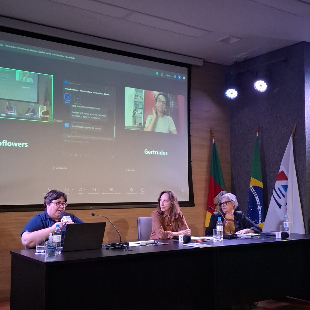 Na noite de quarta-feira (08/04), a ADUFRGS-Sindical realizou uma mesa-redonda com o tema “Feminicídio e violência de gênero: desafios para a universidade e a sociedade”, no auditório do sindicato e na plataforma Zoom, com transmissão ao vivo pelo YouTube.
