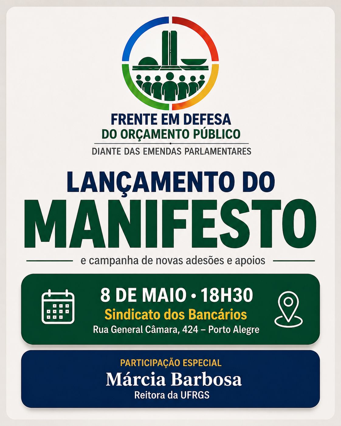 A ADUFRGS-Sindical convida para o lançamento do Manifesto da Frente em Defesa do Orçamento Público diante das Emendas Parlamentares, no dia 8 de maio, às 18h30, na sede do Sindbancários, no Centro de Porto Alegre. O documento reúne análises, críticas e propostas sobre os impactos do atual modelo de emendas parlamentares no Orçamento Público, no planejamento estatal, na transparência administrativa e na democracia. A Frente conta com 25 entidades da sociedade civil, entre elas a ADUFRGS-Sindical, que apoia a luta por orçamento público e democracia.