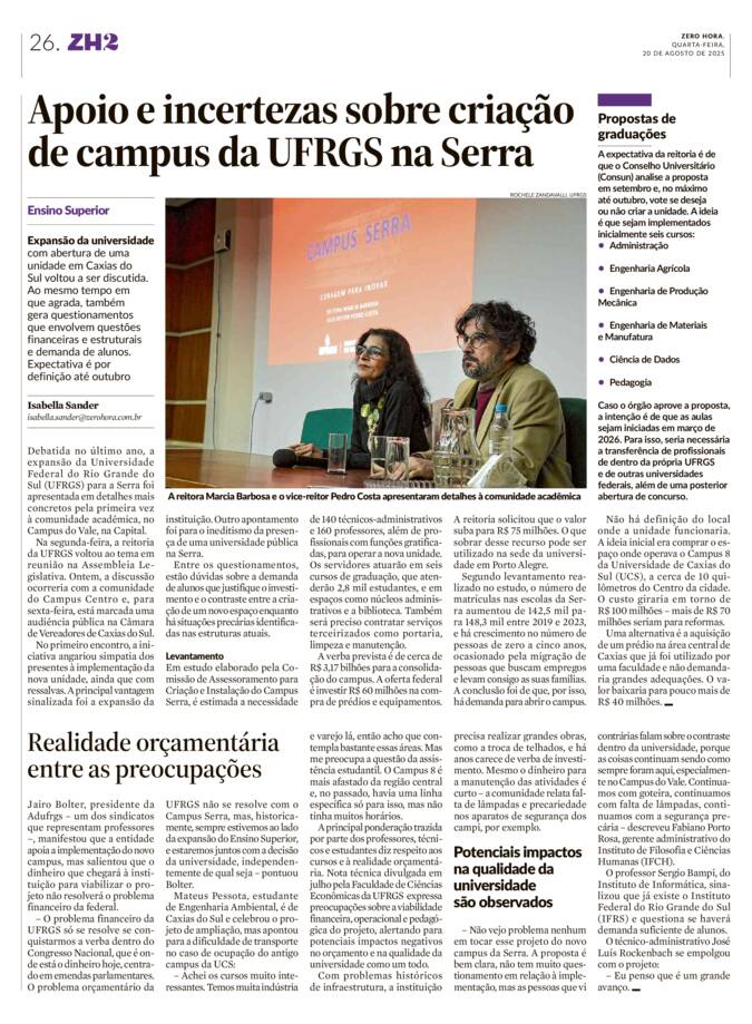 O professor Sergio Bampi, do Instituto de Informática, sinalizou que já existe uma federal que oferece Ensino Superior na Serra: o Instituto Federal do Rio Grande do Sul (IFRS). Por esse motivo, questiona se haverá demanda suficiente de alunos.