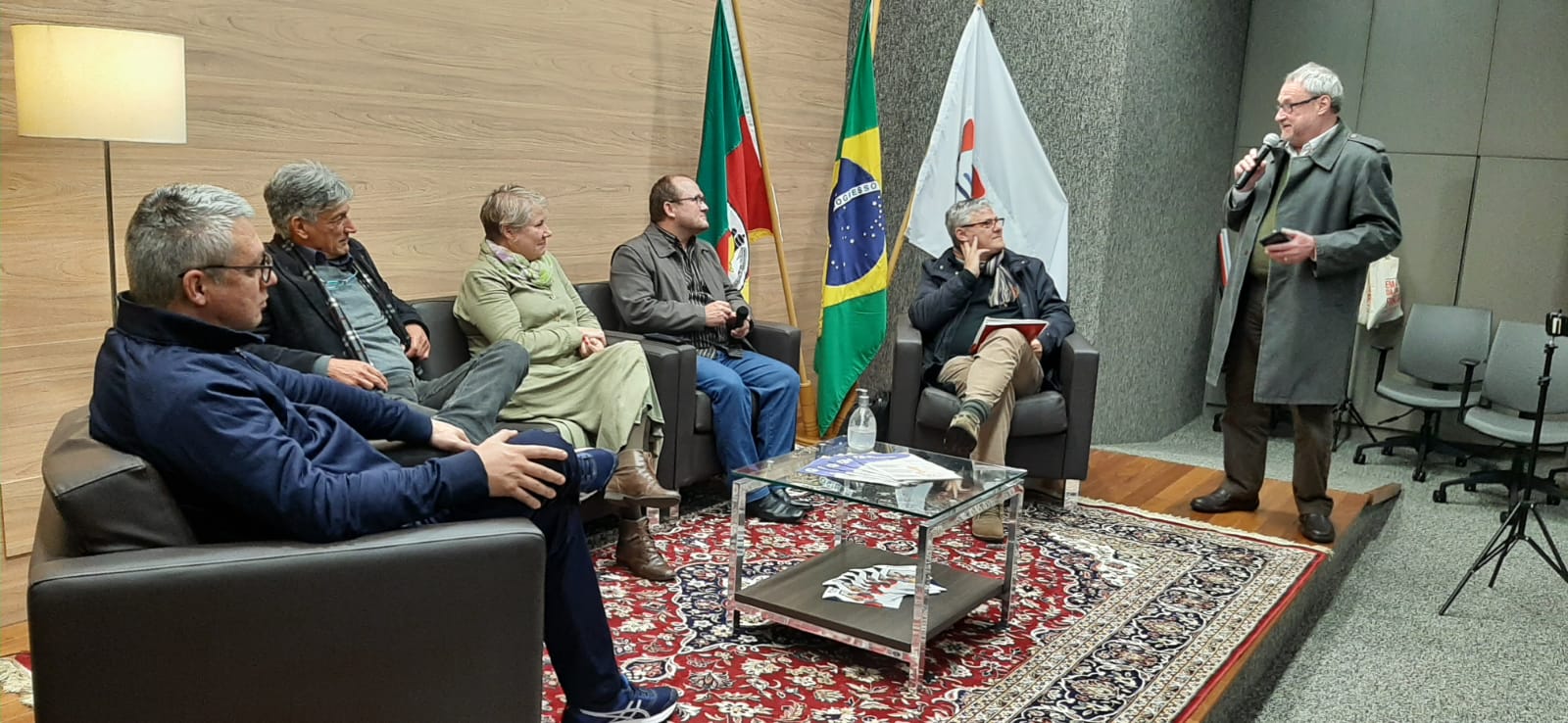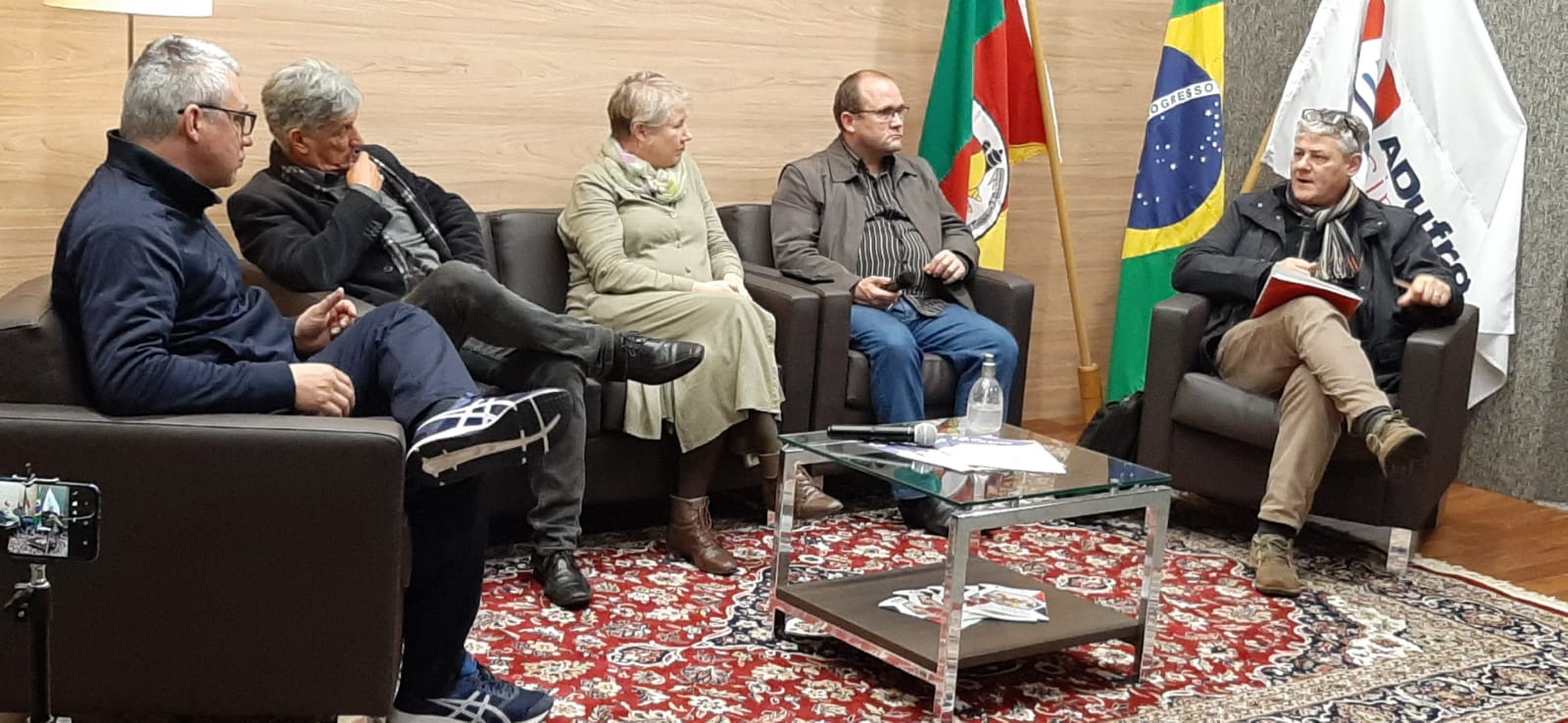 Eduardo Rolim, Sônia Mara Ogiba e Maria de Lourdes Gomes, diretor/as de Tesouraria, de Comunicação e de EBTT da ADUFRGS, respectivamente, também acompanham a atividade, que conta ainda, com a presença de ex-presidentes e diretores.